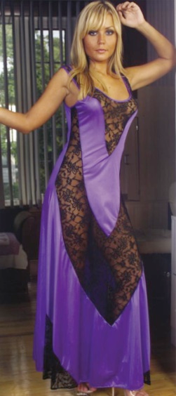 Item #6742 Long Nylon Gown with Inset Lace Panels Colors: Purple with Black Lace (as shown), Red with Black Lace, all Black $30