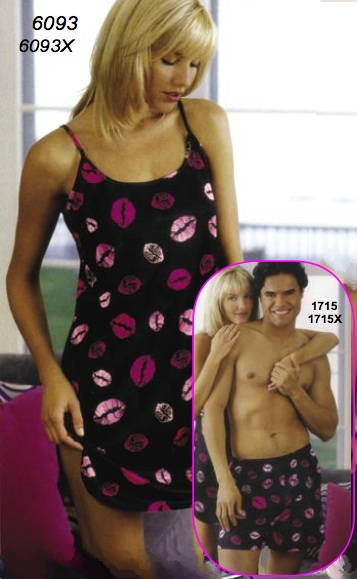 Item #6093 Her Chemise & His Boxers. Colors “Kissing Lips” "Leopard" "Happy Hour" "X-O-X-O" Chemise/Boxer $35 Chemise $25 Boxer $10