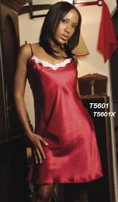Item #5601 Satin Charmeuse chemise with scalloped lace trim. Tie straps. Color: Dark Red $25